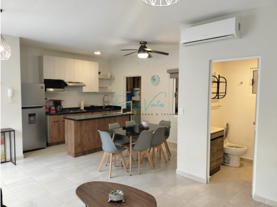 Rento departamento amueblado en Jardines de Mayakoba. El departamento se encuentra totalmente amueblado y listo para habitar. Cuenta con 2 recámaras, 1 baño, 1 lugar de estacionamiento y alberca compartida en el condominio. Se encuentra en planta baja.
